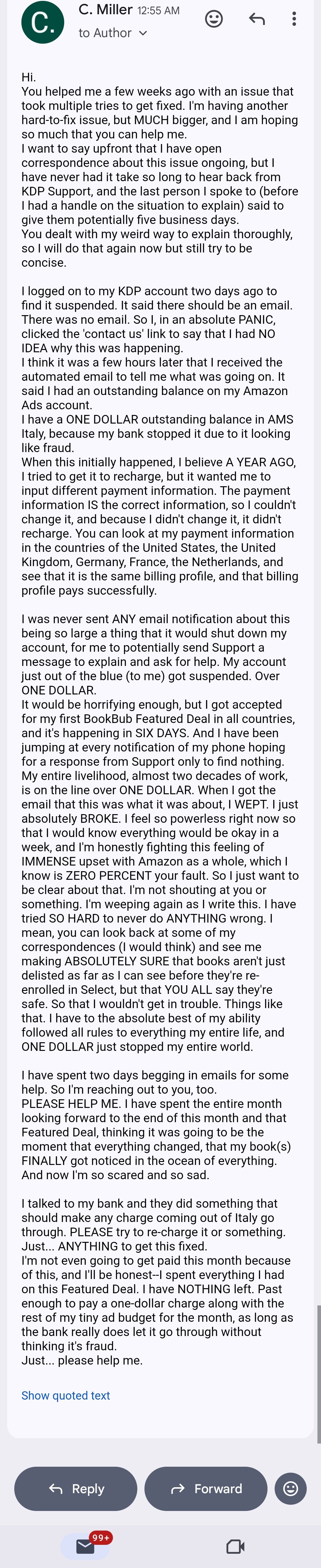 Anyone who has interacted with KDP Support would PROBABLY say the same or similar things as what I will. They are TOP NOTCH. Especially when you’ve interacted with support from other companies. KDP Support, I’ve had dozens if not over a hundred interactions with them in the last few years, and there have only been maybe three to five instances where I was unhappy, maybe one or two where I was upset after. When KDP Support makes you feel safe, heard, even cared about, it can lull you into a false sense of security. And I believed, wholeheartedly, that if I genuinely did my best, everything could get worked out fine. Before now, I’ve ever only had one (what I would consider to be) serious issue with book stuff. But it was nothing compared to this.